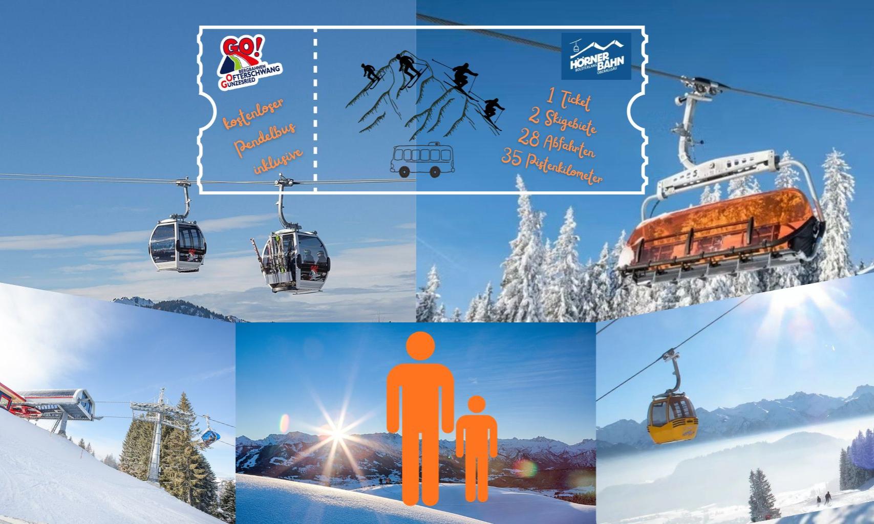 Mit nur einem Ticket können Sie ihren perfekten Skitag vollkommen nutzen. Zur Verfügung stehen gleich zwei Skigebiete mit insgesamt 35 vielfältigen Pistenkilometern für Groß und Klein. Bei optimaler Schneelage haben Sie auf 28 Abfahrten feinsten Skigenuss und die Möglichkeit mit dem kostenlosen Pendelbus zwischen der Hörnerbahn und der Bergbahn Ofterschwang-Gunzesried je nach Belieben zu pendeln. Insgesamt sind bis zu 13 Anlagen/Lifte nutzbar (ja nach tatsächlicher Schneelage).